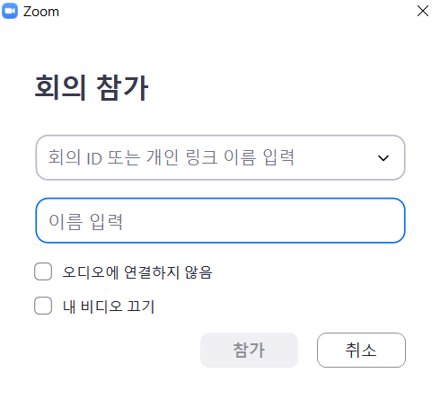참가 클릭시 아래와 같이 줌 회의번호 등을 입력하는 창이 동일하게 나타납니다.