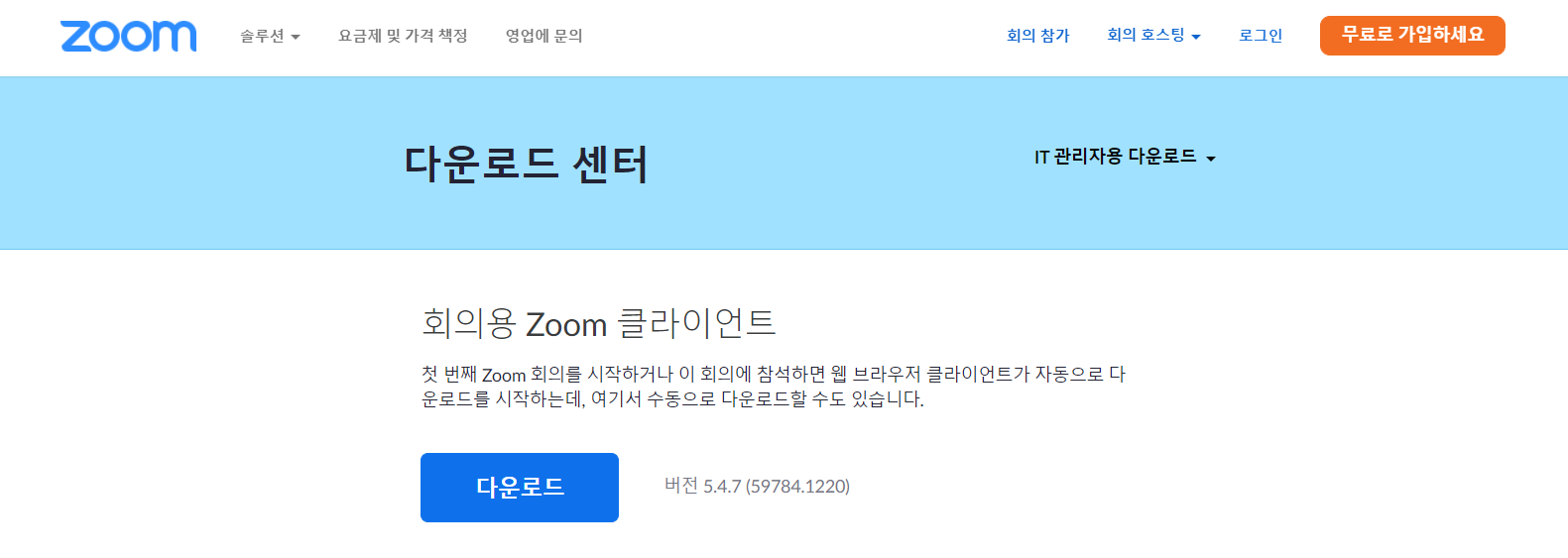 화면의 다운로드를 눌러 줌 클라이언트를 설치하고 실행하면 됩니다.