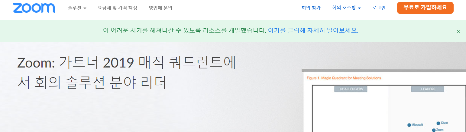 줌 클라이언트를 설치하기 위해 먼저 줌 홈페이지에 접속합니다. 홈페이지 상단에 '회의 참가'를 클릭합니다.