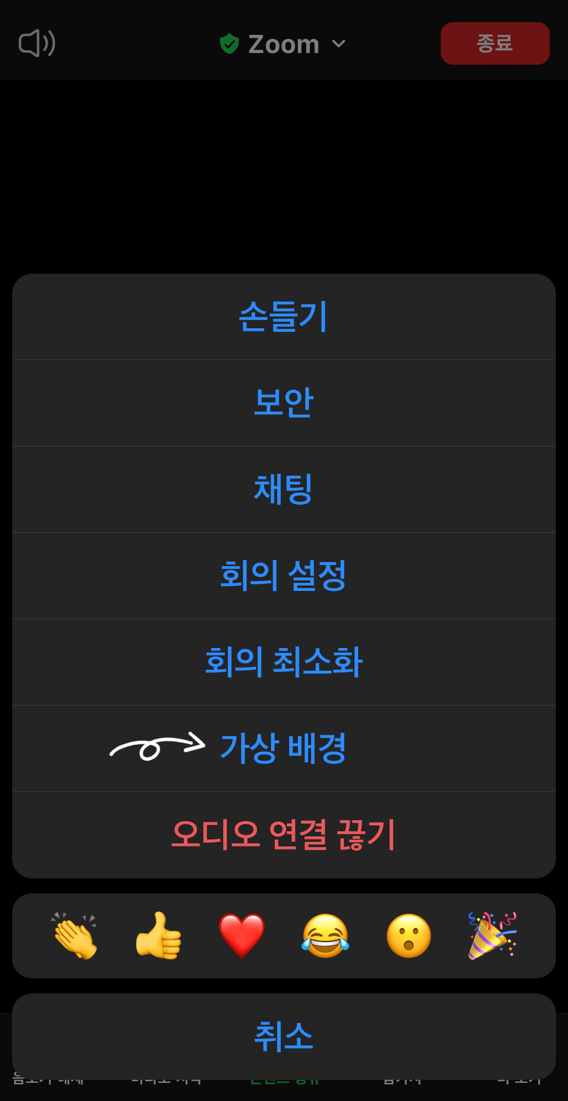 '더 보기'를 누르면 아래의 화면과 같은 메뉴들이 나타납니다. 줌 회의시 사용할 가상 배경화면을 설정해야하므로 '가상배경' 메뉴에 접속하면 됩니다. '가상배경' 메뉴를 터치합니다.