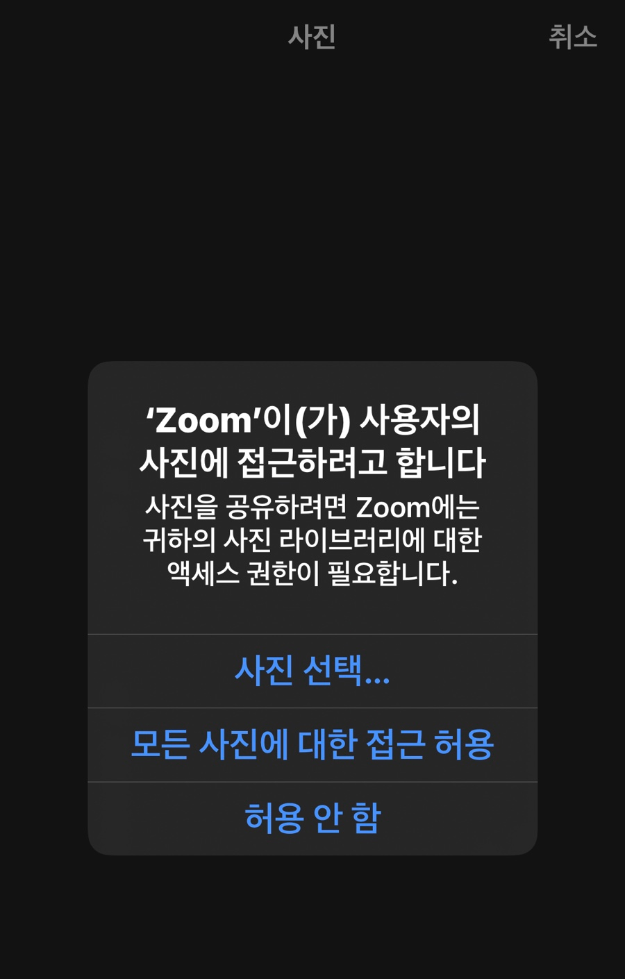 '+'를 누른 뒤 아래와 같은 화면에서 줌 어플에 아이폰 또는 아이패드의 사진에 접근할 수 있는 권한을 허용합니다. 줌 어플에 사진 접근 권한이 부여된 다음 원하는 사진이나 그림을 줌 회의 가상 배경화면으로 설정할 수 있습니다 (특정 사진에 대한 권한을 선택적으로 부여하는 것도 가능합니다).
