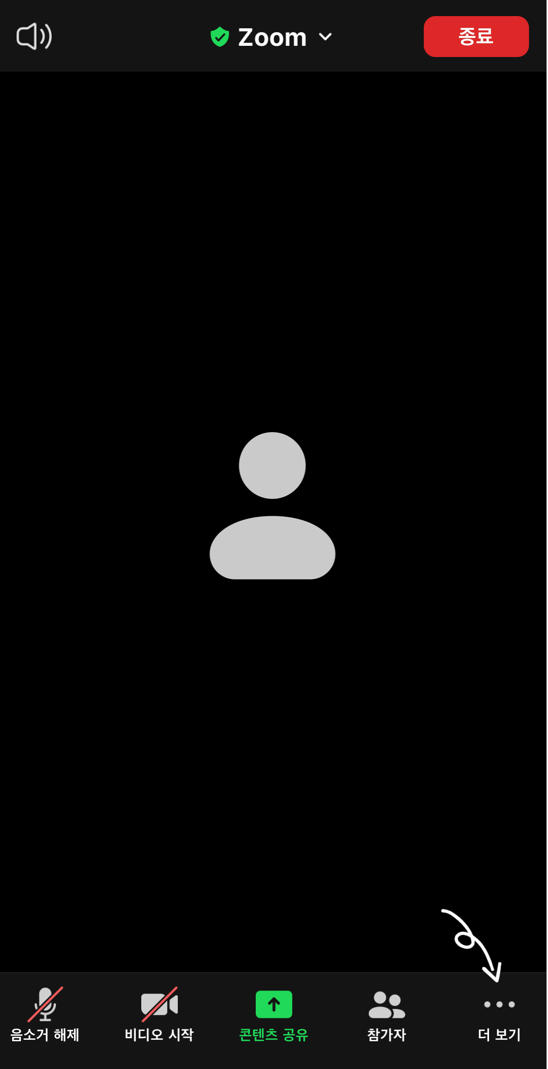 핸드폰이나 태블릿에서 줌 회의 가상배경을 설정하기 위해 먼저 줌 어플을 통해 회의에 접속하거나 새 회의를 생성합니다. 회의를 참석하면 나타나는 아래의 화면에서 '더보기'를 터치합니다 (본 포스팅은 아이폰과 아이패드 줌 어플에서 가상배경 화면을 설정 했습니다).